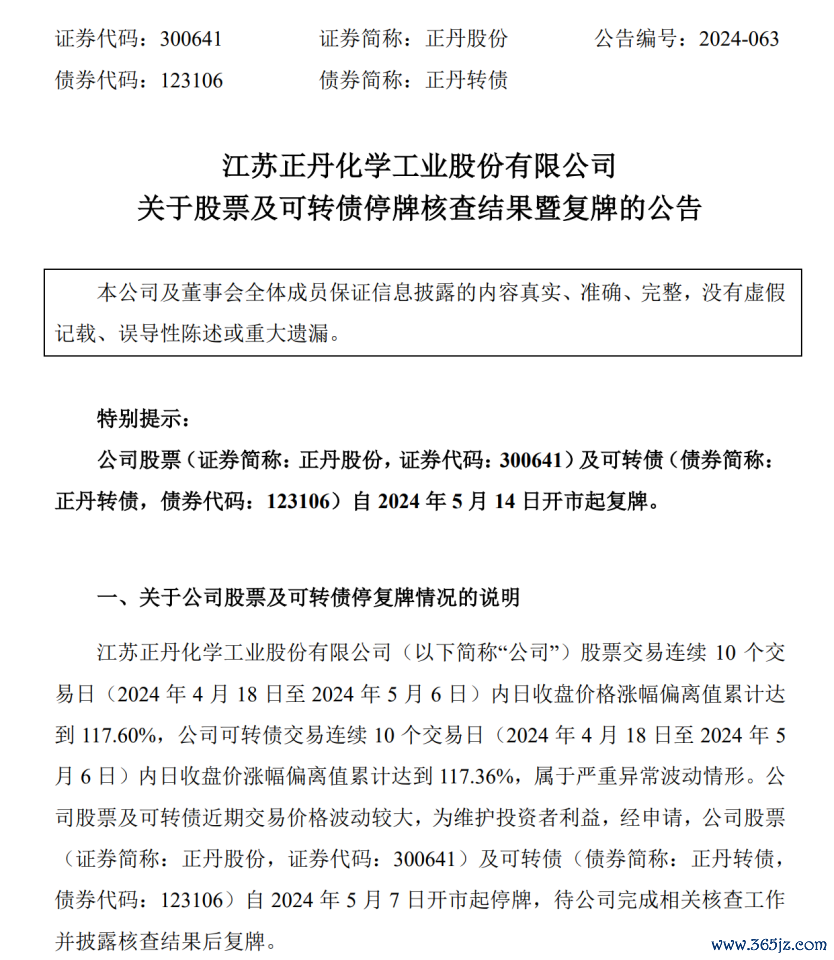 5月13日晚间,正丹股份披露公告,该公司就股票和可转债交易异常波动的相关事项进行了核查,鉴于相关自查工作已完成,公司股票将于5月14日起复牌。