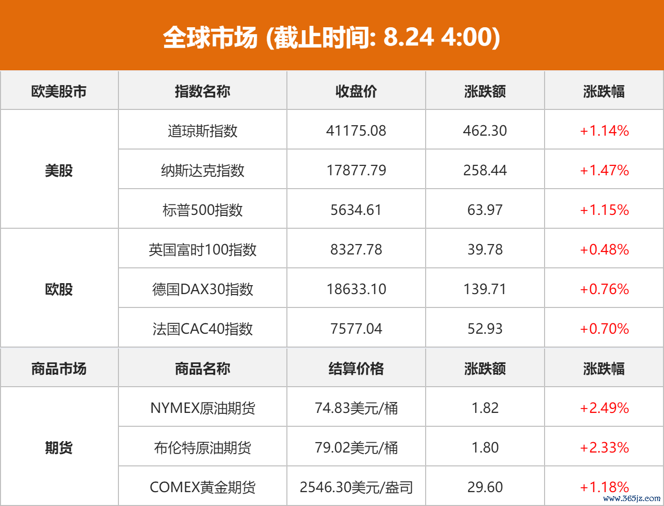 美股市场:美股三大指数均收涨超1%,截至收盘,道琼斯工业平均指数比前一交易日上涨462.30点,收于41175.08点,涨幅为1.14%;标准普尔500种股票指数上涨63.97点,收于5634.61点,涨幅为1.15%;纳斯达克综合指数上涨258.44点,收于17877.79点,涨幅为1.47%。本周,道指累涨1.27%,纳指累涨1.4%,标普累涨1.45%。当地时间周五,美联储主席鲍威尔在杰克逊霍尔年度会议上发表讲话。作为全球市场翘首期待的时刻,美联储主席公开宣告美联储正式进入降息周期。