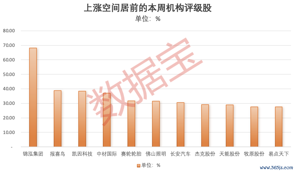 此外,本周获2家以上机构评级的个股中,11股最新收盘价较机构一致预测目标价上涨空间超25%,其中锦泓集团涨幅空间近70%。