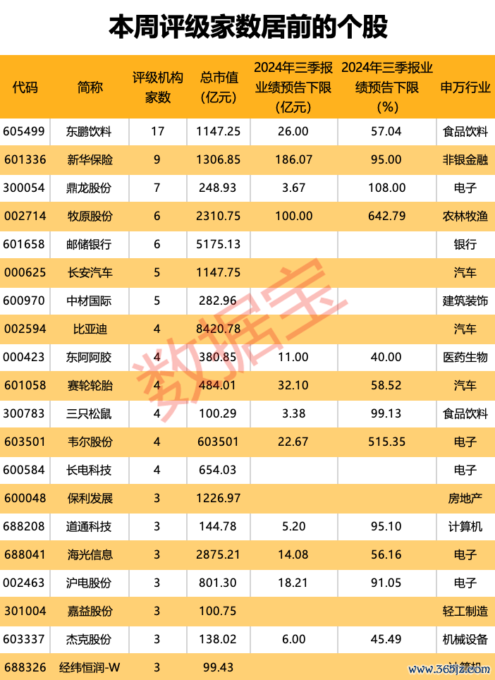 机构关注度最高的是东鹏饮料,共17家机构参与评级;其次,新华保险有9家机构评级,居次席。另外,鼎龙股份、韦尔股份、长电科技、海光信息、沪电股份等半导体个股均有3家以上机构评级。上述多只个股三季报业绩预告较为亮眼。