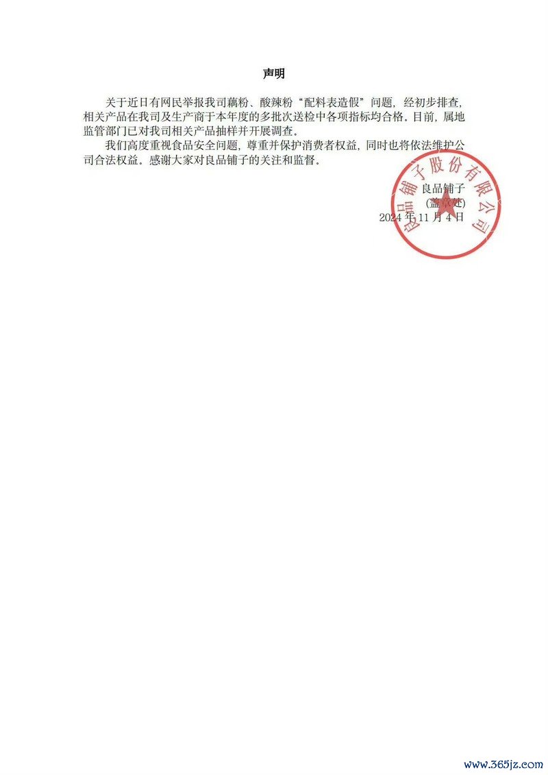 11月4日下午,良品铺子已经在官方微博发布一份声明,“经初步排查相关产品在公司及生产商于本年度的多批次送检中各项指标均合格。目前,属地监管部门已对公司相关产品抽样并开展调查。”