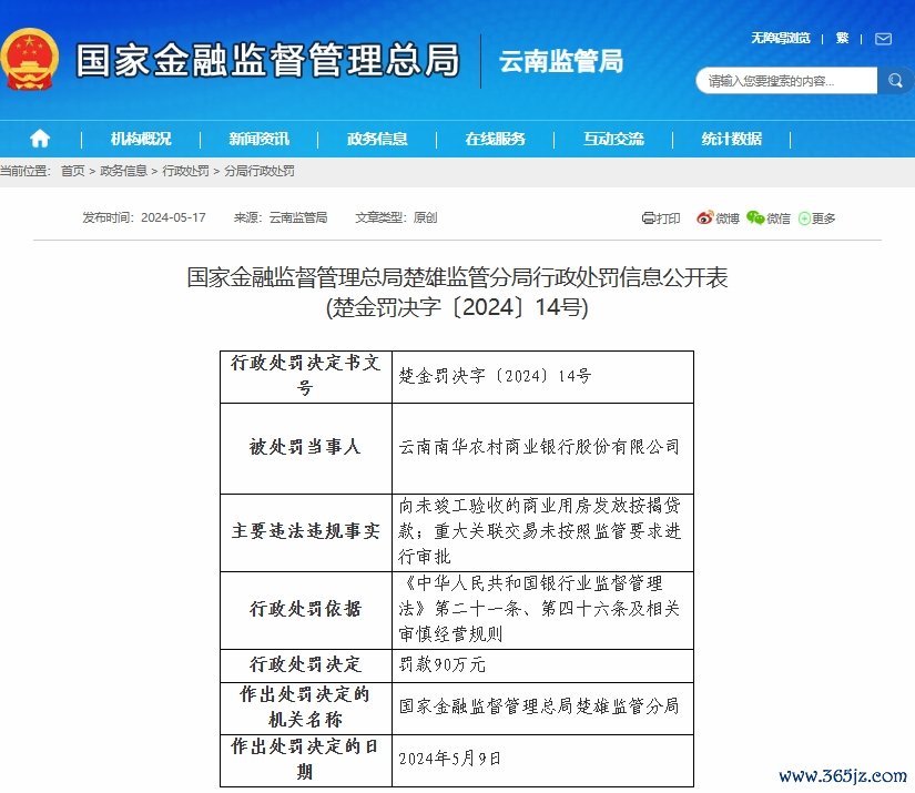 股票配资平台大全 云南南华农商银行被罚90万元:因向未竣工验收的商业用房发放按揭贷款等