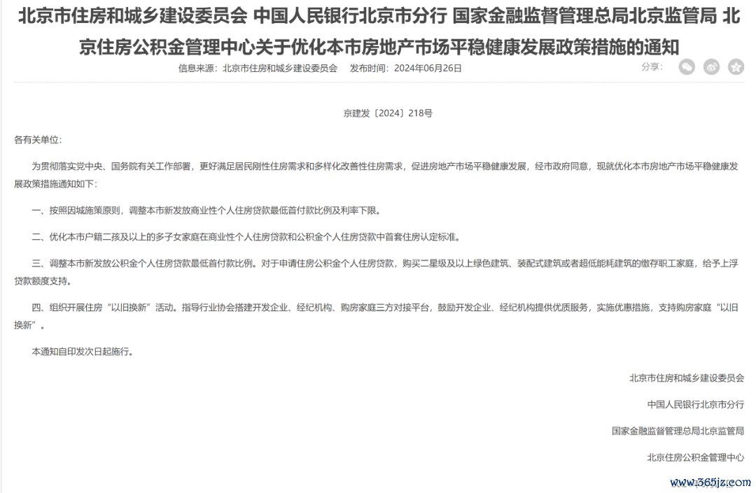 6月26日,北京市住房和城乡建设委员会、中国人民银行北京市分行、国家金融监督管理总局北京监管局、北京住房公积金管理中心联合印发《关于优化本市房地产市场平稳健康发展政策措施的通知》,将购买首套住房最低首付款比例调整为不低于20%;二套住房五环以内调整为不低于35%、五环以外调整为不低于30%。商业贷款利率也进行下调,调整后,首套房5年期以上房贷利率下限为3.5%,二套房五环以内为3.9%,五环以外为3.7%。此外,对北京市户籍二孩及以上的多子女家庭,购买第二套住房的,在个人住房贷款中认定为首套住房。《通知》自2024年6月27日起施行。