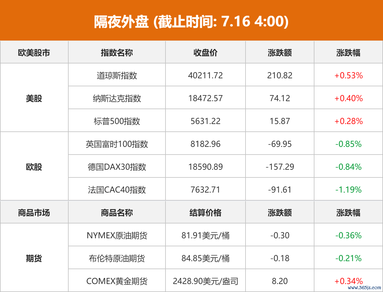 美股:纽约股市三大股指15日上涨,截至当天收盘,道琼斯工业平均指数比前一交易日上涨210.82点,收于40211.72点,涨幅为0.53%;标准普尔500种股票指数上涨15.87点,收于5631.22点,涨幅为0.28%;纳斯达克综合指数上涨74.13点,收于18472.57点,涨幅为0.40%。